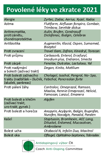 Na základě spolupráce se Státním ústavem pro kontrolu léčiv ADV ČR aktualizoval seznam zakázaných léků. Tento seznam najdete zde a obsahuje výčet léků a v nich obsažené zakázané látky. Následně ADV ČR vytvořil novou informační kartičku s nejběžněji používanými povolenými a zakázanými léky. Tato kartička je k dispozici zde.