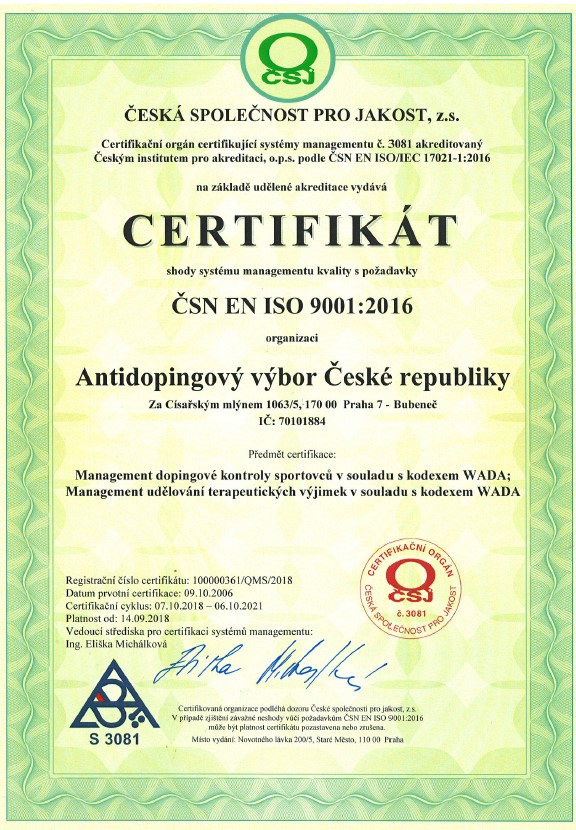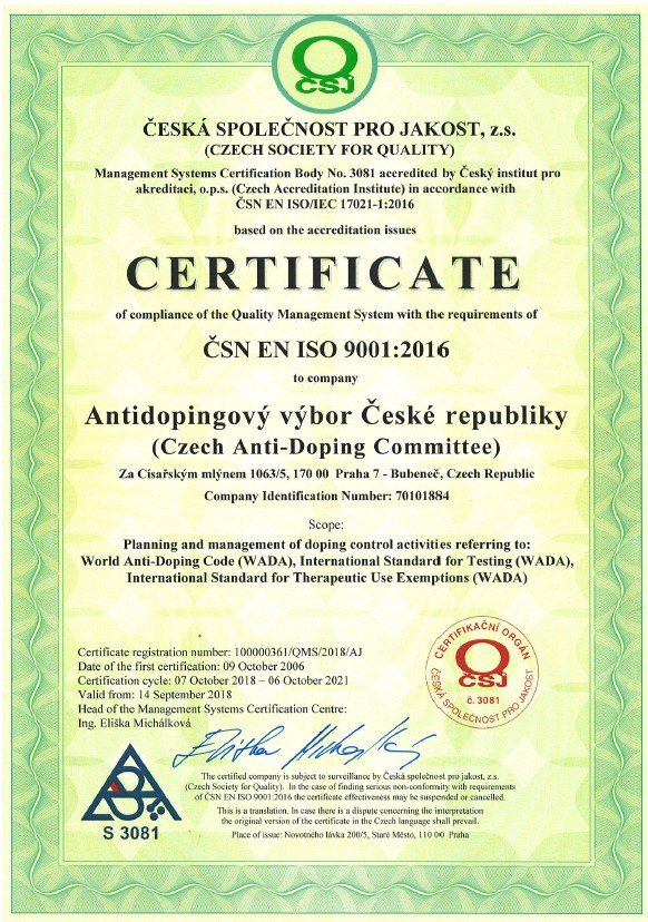 CADC has successfully completed the certification procedure CSQ-CERT by the Czech Society for Quality. CADC has gained the QMS ČSN EN ISO 9001:2009 Certificate for Management of Doping Control in accord with WADA Code and Management of Granting Therapeutic Use Exemptions (TUEs) in accord with WADA Code. By obtaining the Certificate CADC fulfils recognition of the status the National Anti-doping Organization for testing and granting TUEs for the World Anti-Doping Agency (WADA).